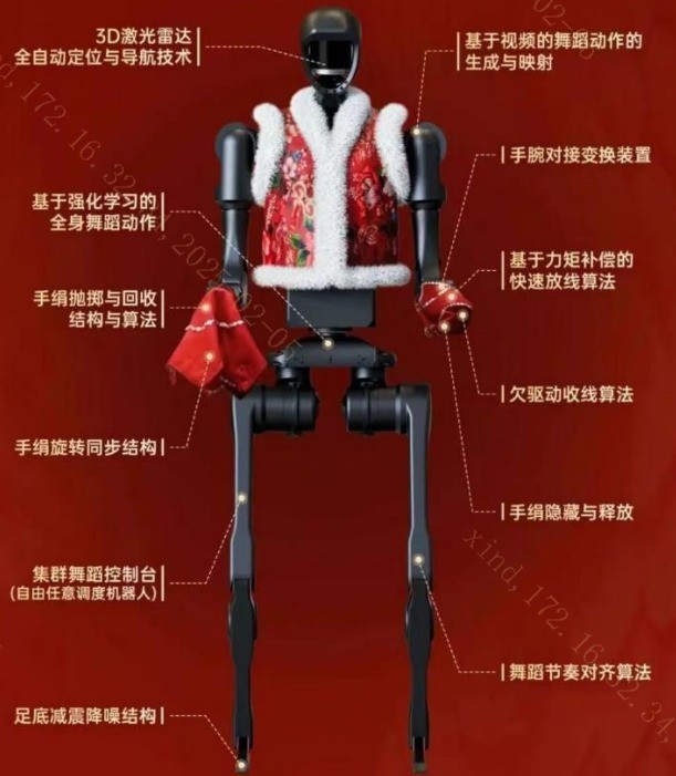 算力是机器人“思考”的基石。在复杂场景中,机器人需实时处理海量数据,例如春晚《秧BOT》的16台机器人需同步完成SLAM定位、动作映射和队形变换,每秒运算量高达数万亿次。这一过程依赖高性能计算芯片(如GPU、ASIC)和分布式计算架构的支持。由于抛手绢结构复杂,因此手腕对接变换装置,同时加入了基于力矩补偿的快速放线算法、手绢抛掷与回收结构与算法、欠驱动收线算法、舞蹈节奏对齐算法、手绢旋转同步结构等,实现了春晚“秧歌舞”的精彩表演。算力的持续升级,为机器人从“执行指令”向“自主决策”演进提供了底层保障。